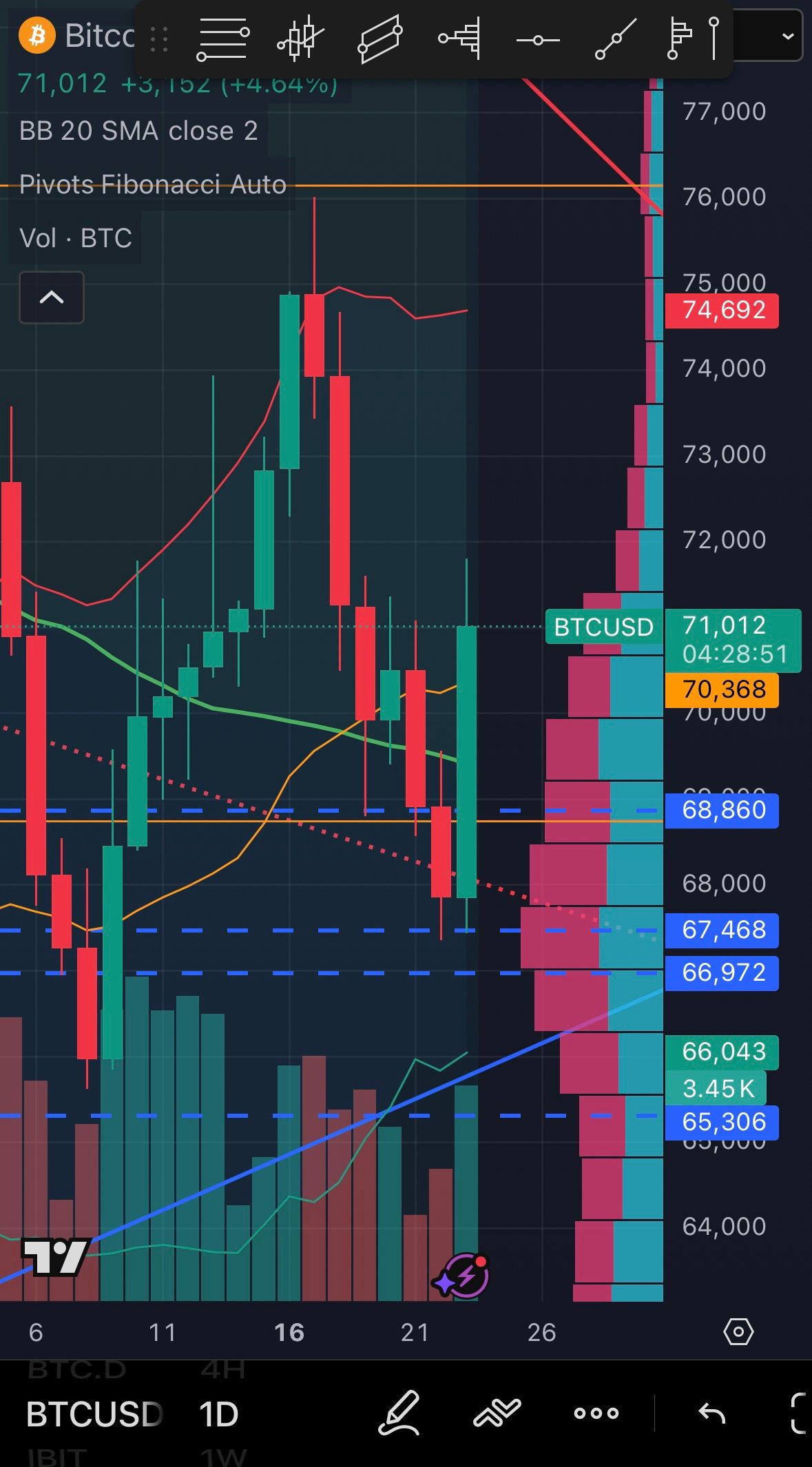 The Weekly timeframe is really where everything is about to be decided. The more weekly closes we get BELOW about $70.3K - the more likely that price will continue to drop toward $64K. If price can consistently close ABOVE $70.3K then eventually one of the momentum waves will break through $76.2K.